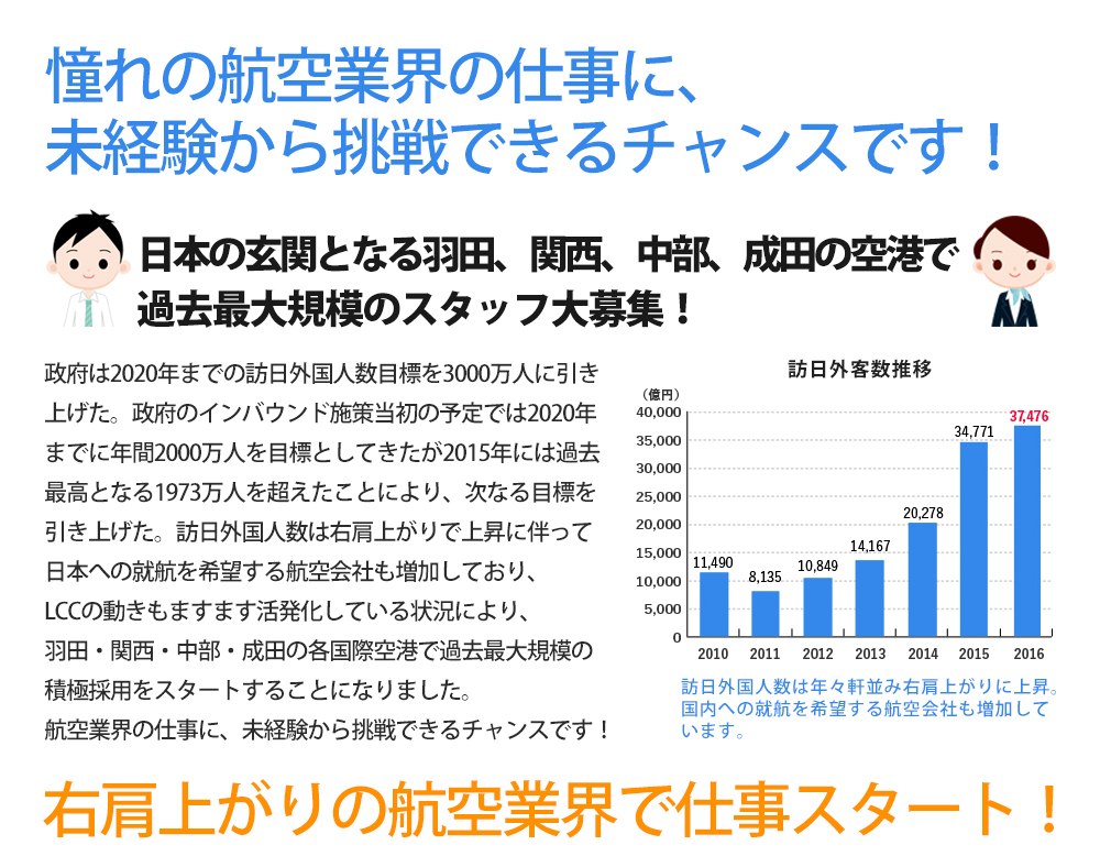 | 募集背景 | 羽田、関西、中部、成田で大規模な積極採用を実施! 「2020年までに訪日外国人旅行者数2000万人を実現」という政府のインバウンド施策を背景に、訪日外国人数は右肩上がりで上昇を続けて います。それに伴なって日本への就航を希望する航空会社も増加していますし、LCCの動きもますます活発化している状況です。このタイミ ングを私たちも飛躍のチャンスと捉え、さらなる成長を遂げていきたいと考えています。そこで羽田・関西・中部・成田の各国際空港で過去最大規模 の積極採用をスタートすることになりました。航空業界の仕事に、未経験から挑戦できるチャンスです! |