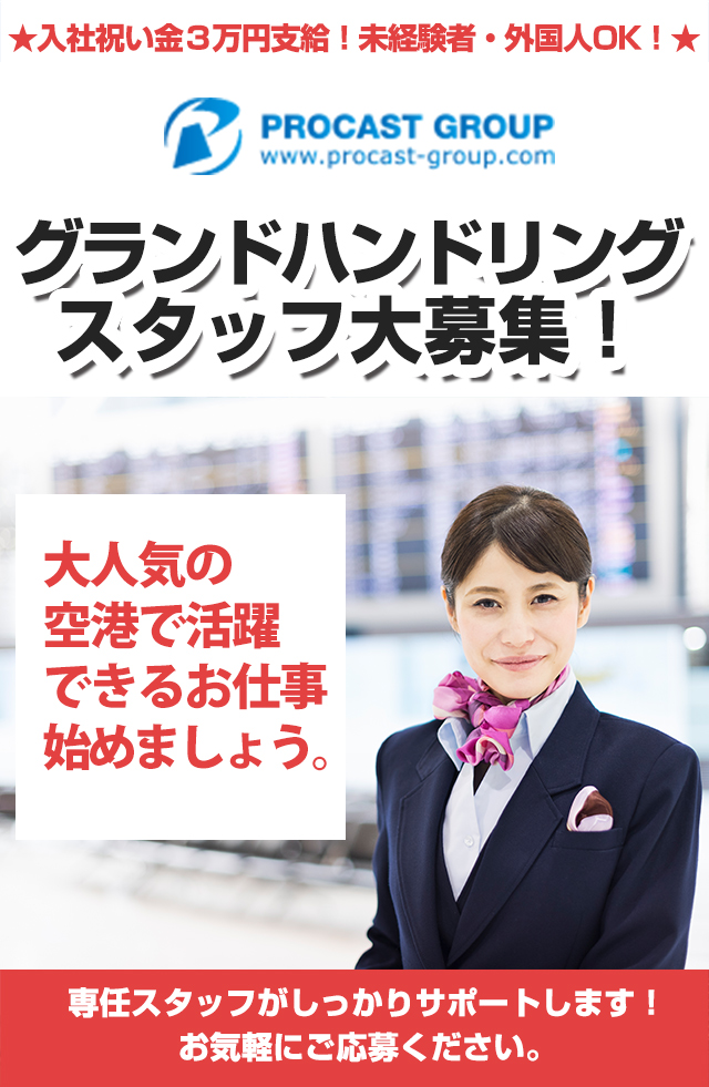 | 応募資格 | 学歴は一切問いません。職種・業界・社会人未経験、第二新卒、職種転換、大歓迎! ★必要なのは、気力と体力のみ!何よりもあなたの意欲を重視します。 ◎飛行機はもちろん乗り物が好きな方、空港で働きたい方、ぜひご応募ください! ◎「グランドハンドリングの仕事は知らなかったけど、この求人広告を見て興味を持った」という方も大歓迎!充実の教育体制を整えていますので、 未経験からでも安心して始められます。 ※英語能力の高い(英検2級、TOEIC 550点以上)方は優遇。 |